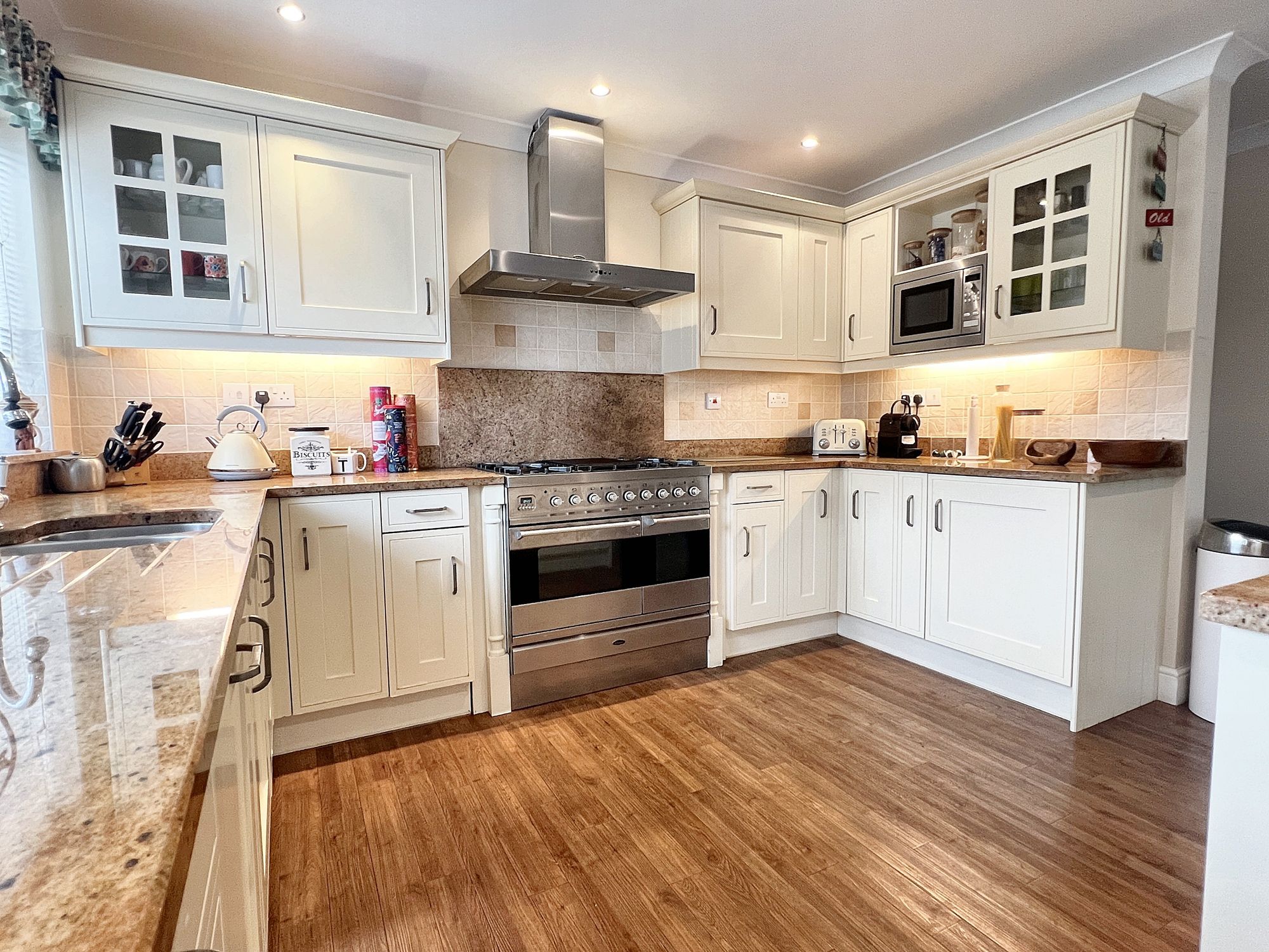 Upvc double glazed bay window to the front of the property and two double glazed windows to the side, door to the conservatory, range of fitted wall and base units with granite work surfaces over and inset one and a half bowl sink, island unit with granite worktop, integrated fridge and dishwasher, space for range cooker with extractor hood over.