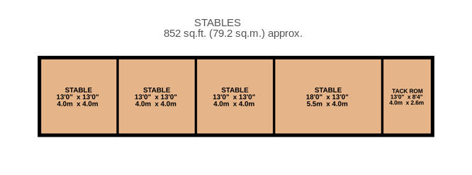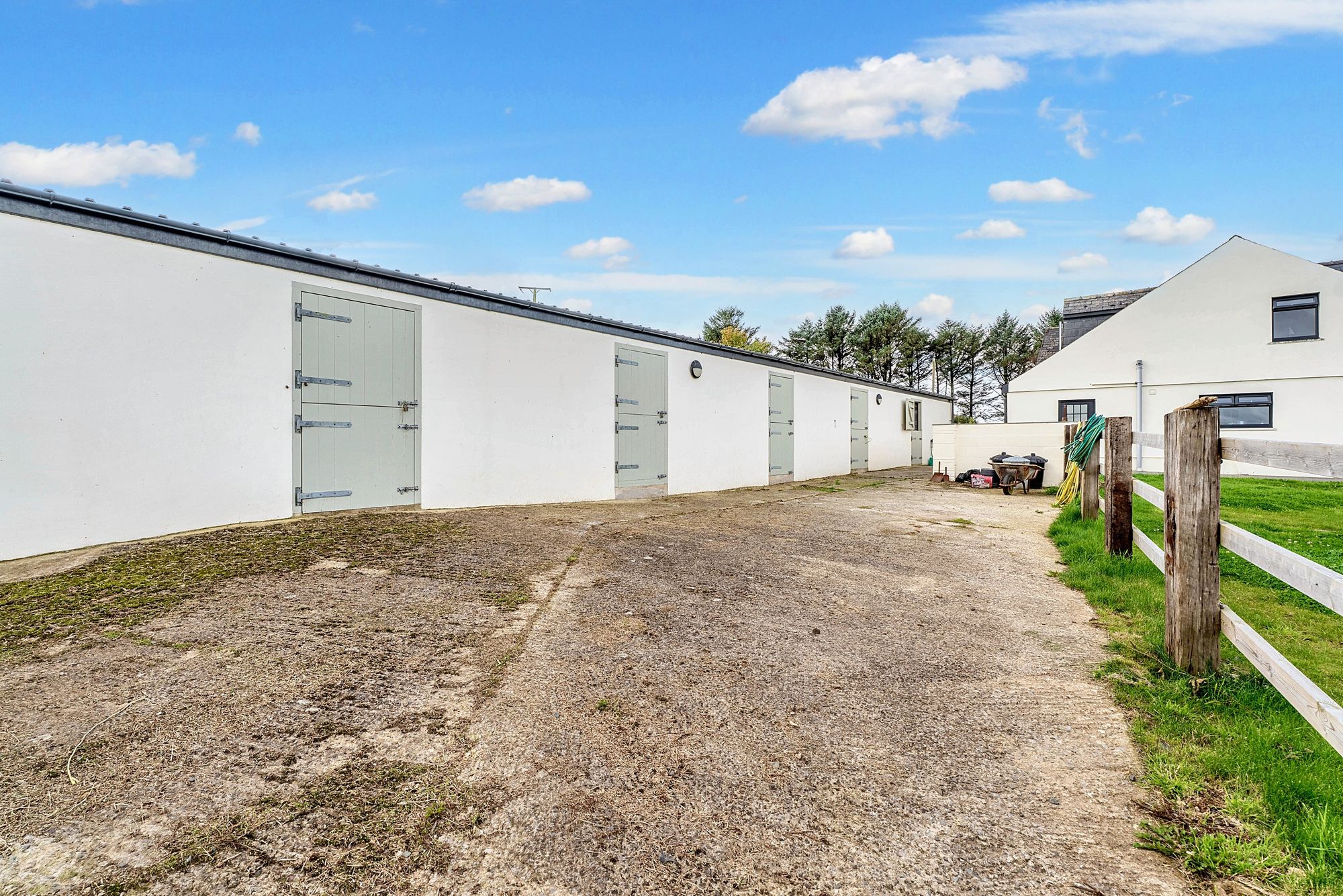 Stable Block - Of concrete block construction with rendered and coloured elevations under an insulated box profile roof. The Stable Block has 5 Stables and a Tack Room. 3 Stables measure 13'0" x 13'0" approx and have a single glazed window and wall lights. The Main Stable is 18'0" x 13'0" which has a single glazed window, 2 LED strip lights, electricity consumer unit, 2 power points and an opening to