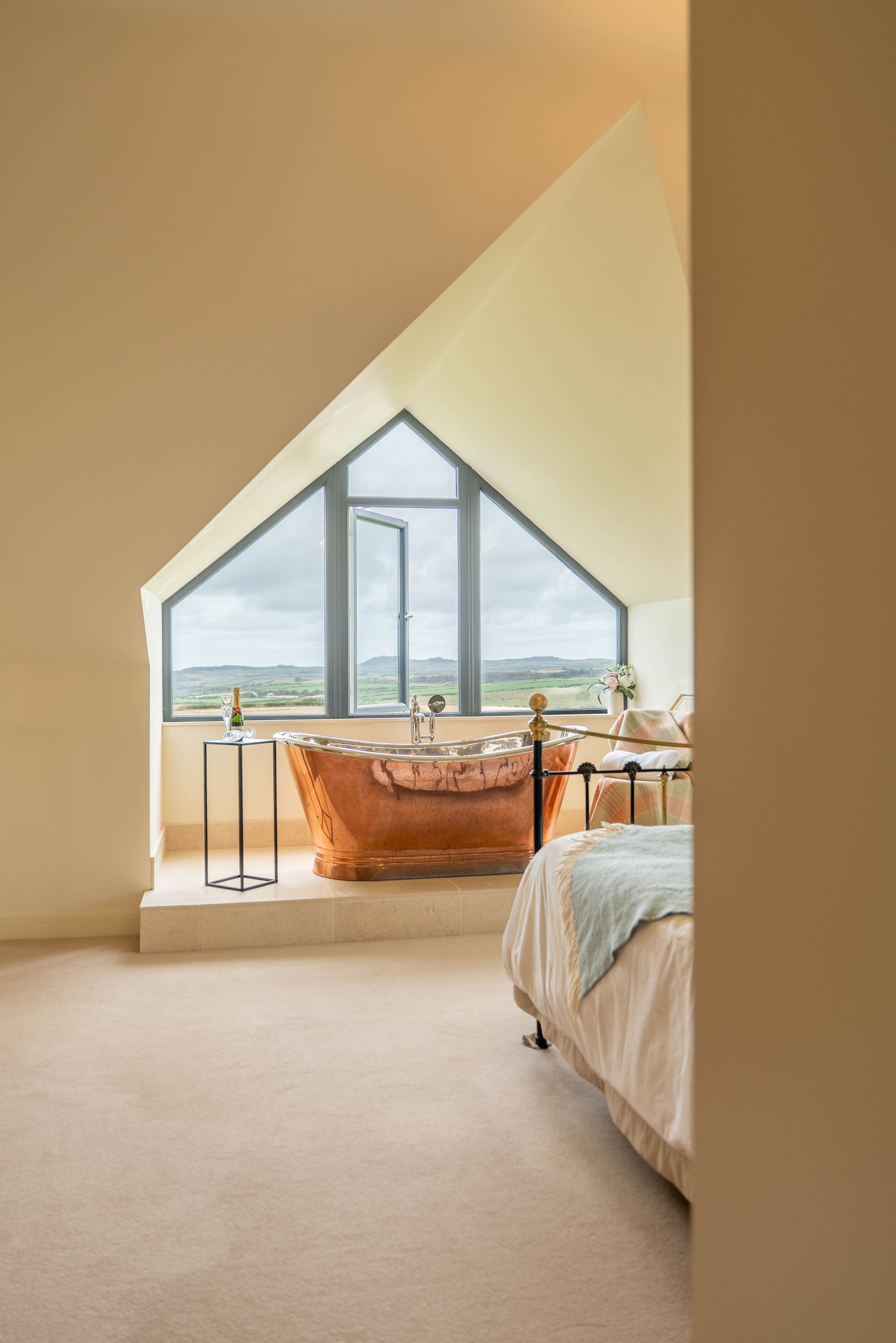 • Sumptuous, elevated, roll-top copper bath with coastal and countryside views framed beautifully in bespoke picture window.