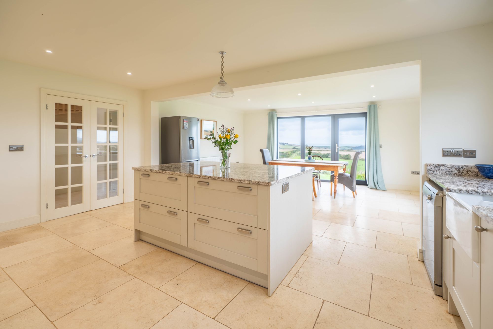 • Magnificent Dining Kitchen with open un-interrupted views across countryside to the coast, fully fitted kitchen with granite surfaces, integrated appliances and central island.