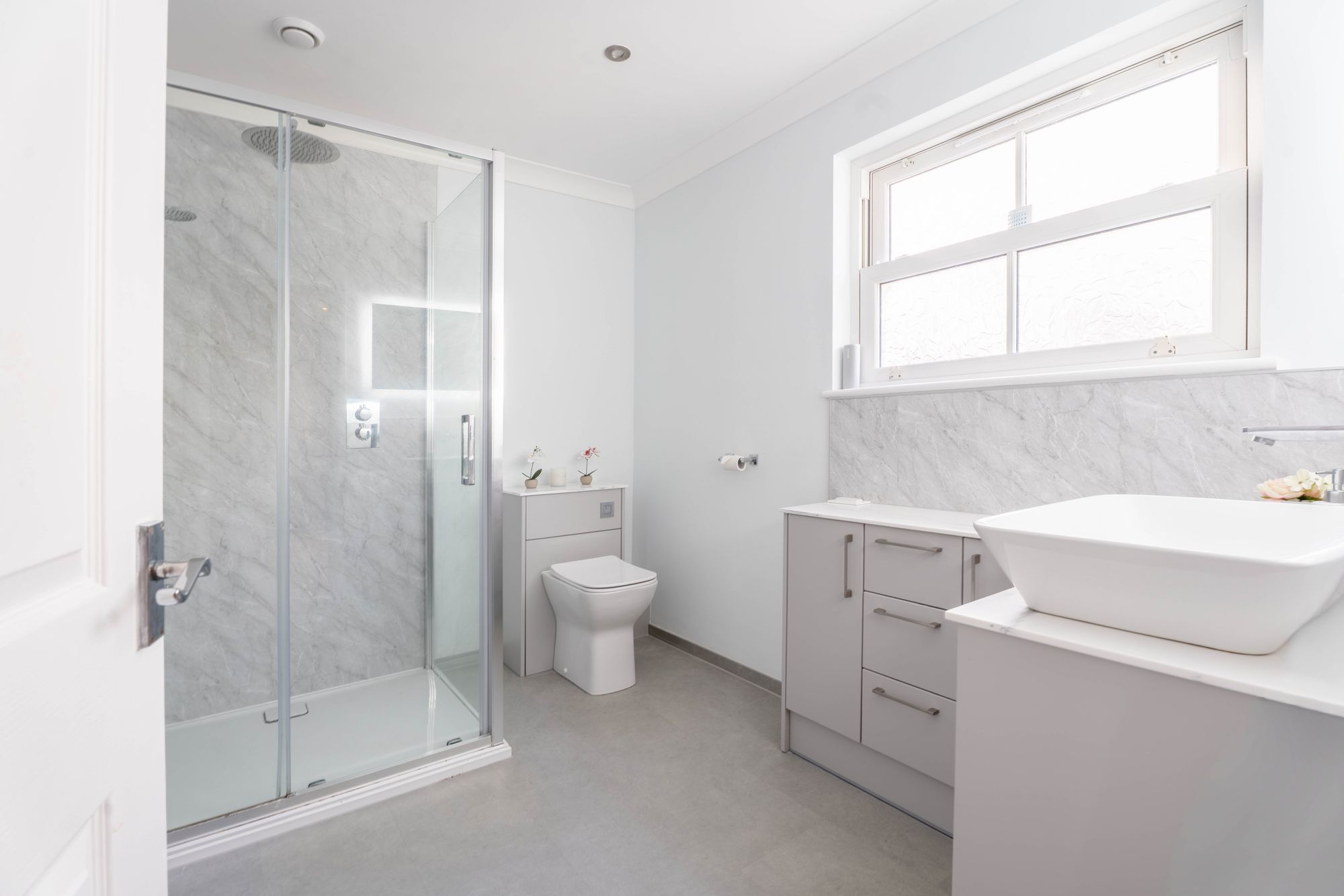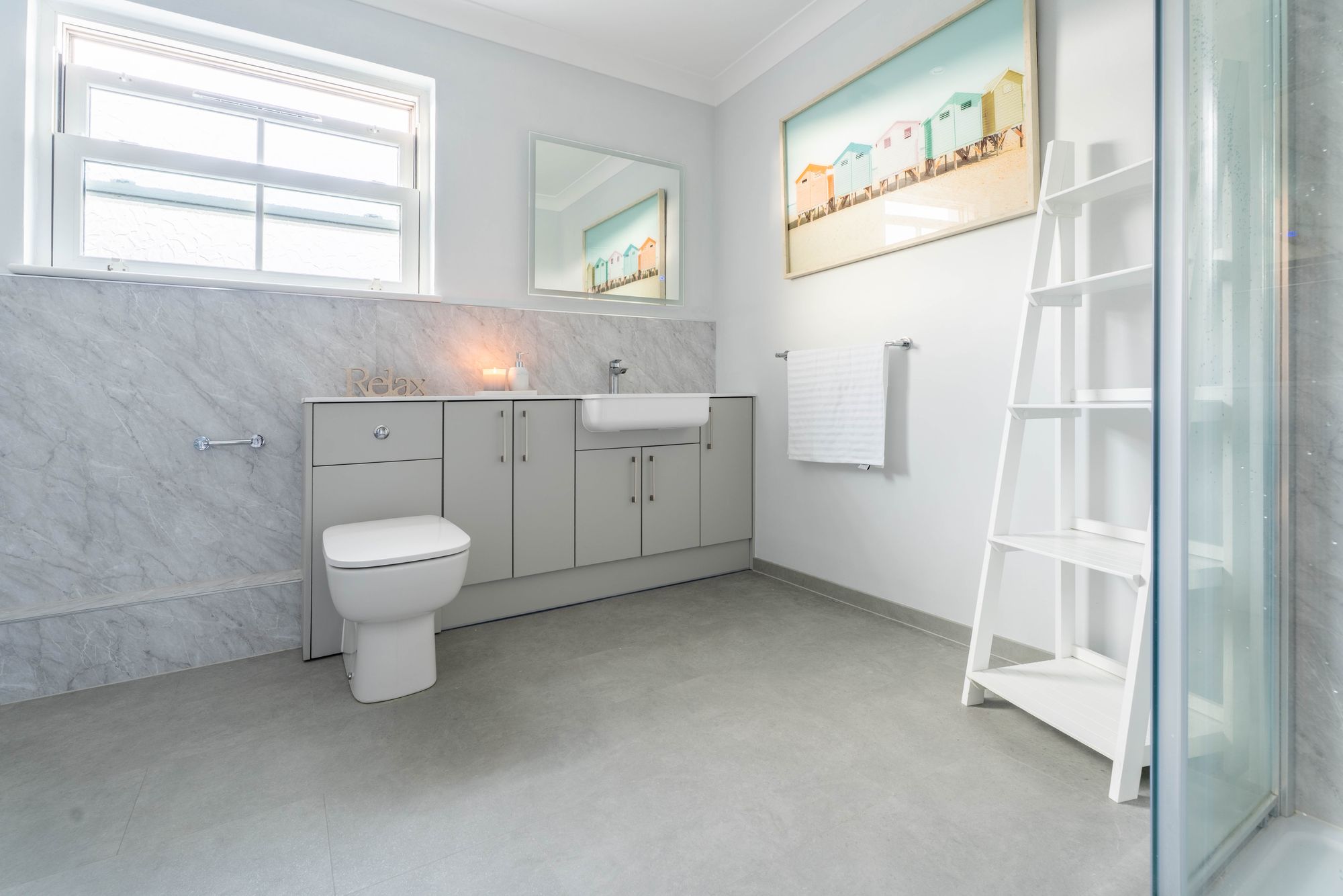 With vanity wash hand basin, WC, separate shower cubicle and wonderful bath. Stone effect to walls and vinyl locking panel flooring.