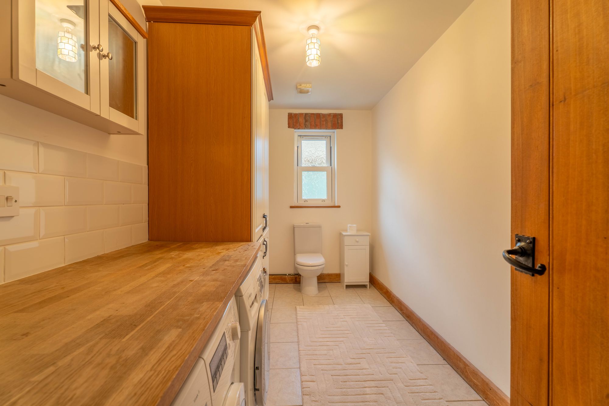 With plumbing and space for appliances with work surfaces over and downstairs WC with wash hand basin. Obscured window to the side.