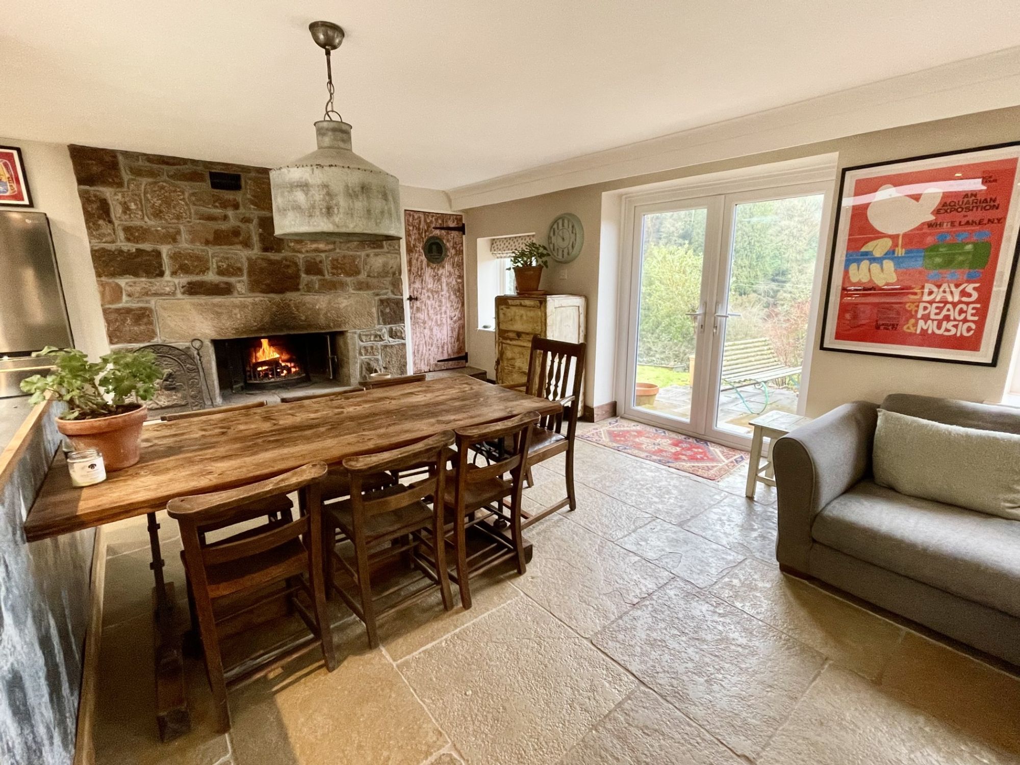 Sumptuous relaxation is provided in the sitting room with wonderful exposed beams to ceiling. Natural light cascades through the windows here, original stone steps leading to the master bedroom that were discovered behind a false cupboard in the sitting room when renovation works were undertaken, the stone fireplace and hearth with log burning stove, and fantastic original bread oven complete this room wonderfully.